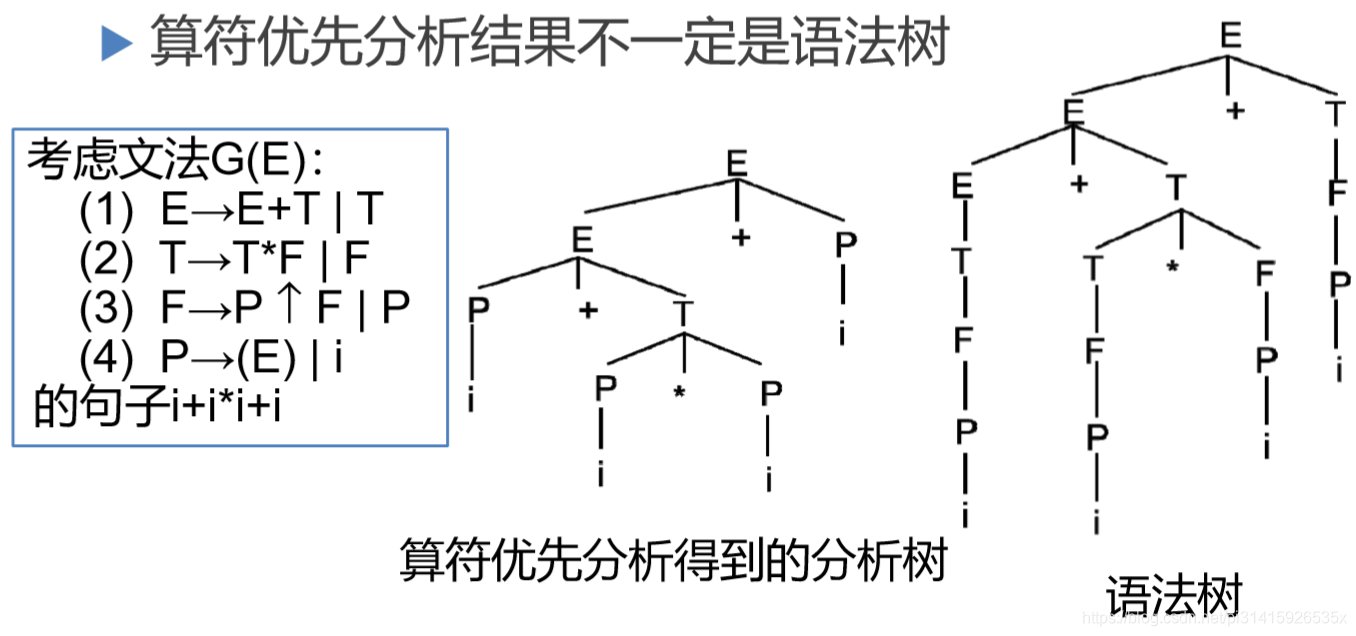 根据上面的规约那一部分的算法可知:对于文法的句子来说,它的算符优先分析的结果 不一定 就是语法树,所以语法树和分析树要分开指代,这章一开始便已强调: